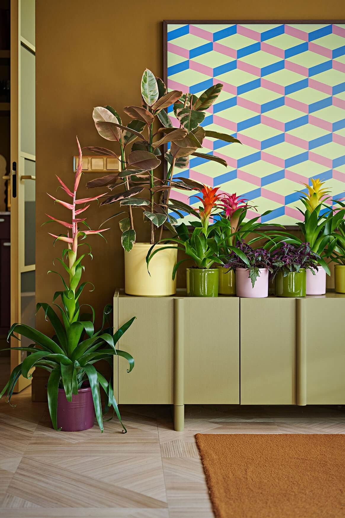 In het kleurpalet zien we veel kleuren die elkaar op een natuurlijke manier aanvullen. Zoals zandtonen, terracotta, mosgroen en gebroken wit. Ze vormen de perfecte achtergrond voor planten met een volle bladstructuur of subtiele bloei. Door middel van matte materialen en natuurlijke texturen onstaat een uitnodigende sfeer die balans brengt in het interieur. Daarnaast versterken planten met frisgroene of diepgroeen bladeren dat gevoel en zorgen voor levendigheid binnen het zachte, serene geheel.