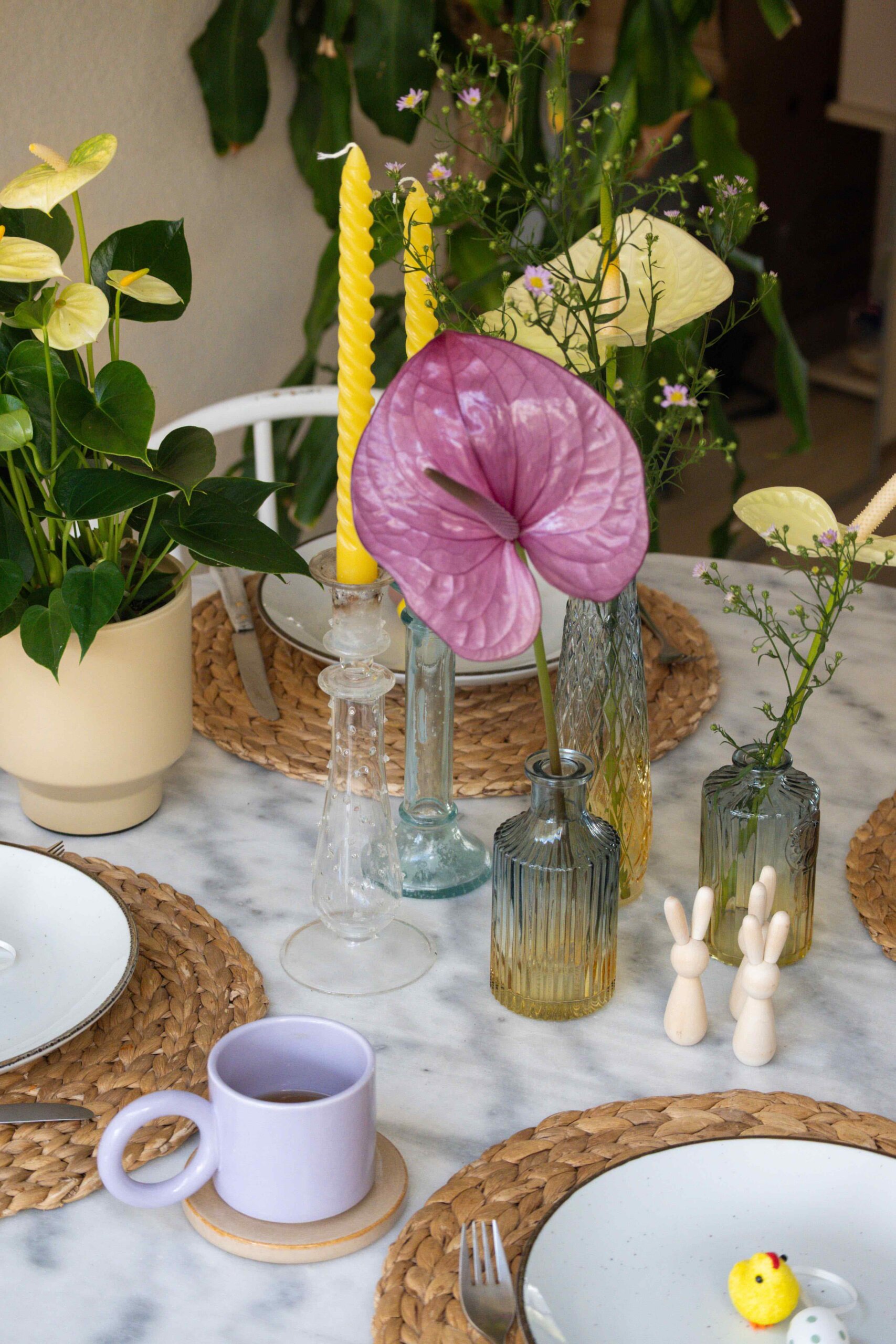 A yellow & purple Easter table with Anthuriums